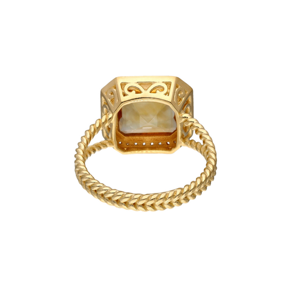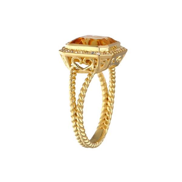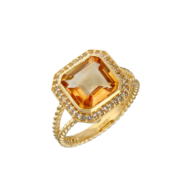 Dieser exquisite Ring präsentiert einen auffälligen quadratisch geschliffenen Citrin im Zentrum, der warme goldene Töne ausstrahlt. Umgeben wird der Citrin von einem zarten Halo aus brillantgeschliffenem weißem Topas, der seine Leuchtkraft verstärkt und einen Hauch von raffiniertem Funkeln hinzufügt.